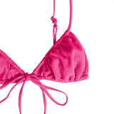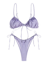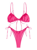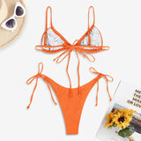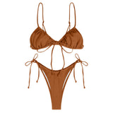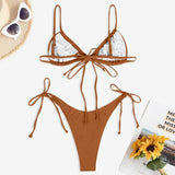 - Features: Frilled trim, high cut, drawstring strap, tie front and tie side, removable padded